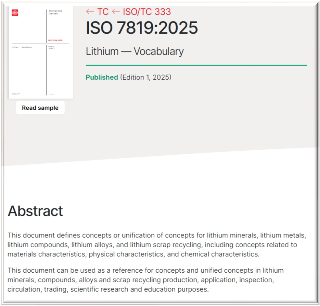 ▲ISO网址关于 ISO 7819《锂术语》的介绍