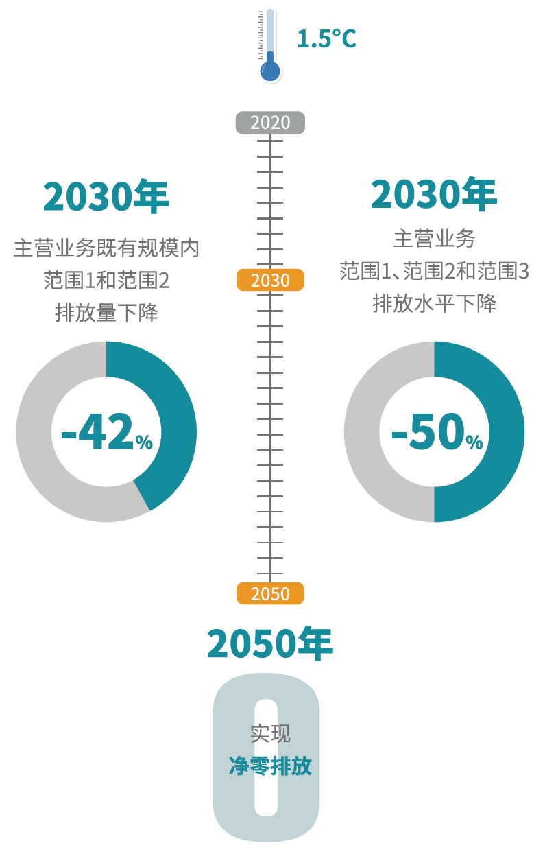 伟德国际victor1946承诺将持续降低主营业务既有规模内范围1和2排放,到2030年相比基准年排放量下降42%以上;争取到2030年实现主营业务范围1、范围2和范围3排放水平相比基准年下降50%,并在2050年前实现净零排放。